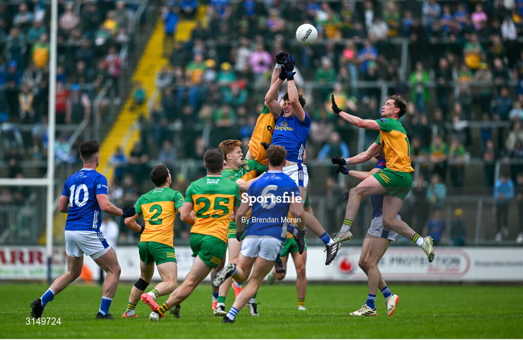 1 June 2025; Evan Crowe of Cavan in action against Hugh McFadden and Ciarán Thompson of Donegal, right, during the GAA Football All-Ireland Senior Championship Round 2 match between Cavan and Donegal at Kingspan Breffni in Cavan. Photo by Brendan Moran/Sportsfile