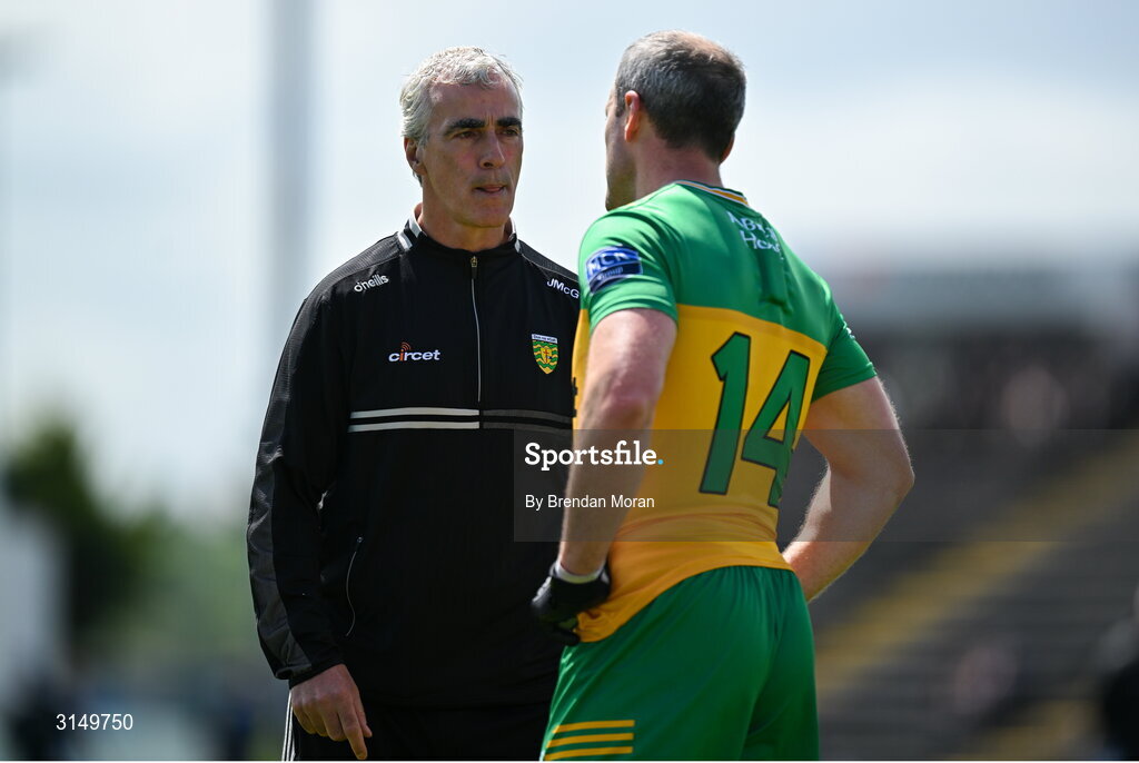 1 June 2025; Donegal manager Jim McGuinness, left, and Michael Murphy of Donegal before the GAA Football All-Ireland Senior Championship Round 2 match between Cavan and Donegal at Kingspan Breffni in Cavan. Photo by Brendan Moran/Sportsfile
