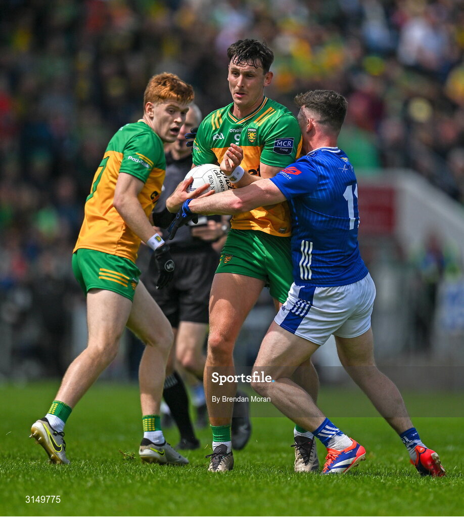 1 June 2025; Michael Langan of Donegal is tackled by Dara McVeety of Cavan during the GAA Football All-Ireland Senior Championship Round 2 match between Cavan and Donegal at Kingspan Breffni in Cavan. Photo by Brendan Moran/Sportsfile