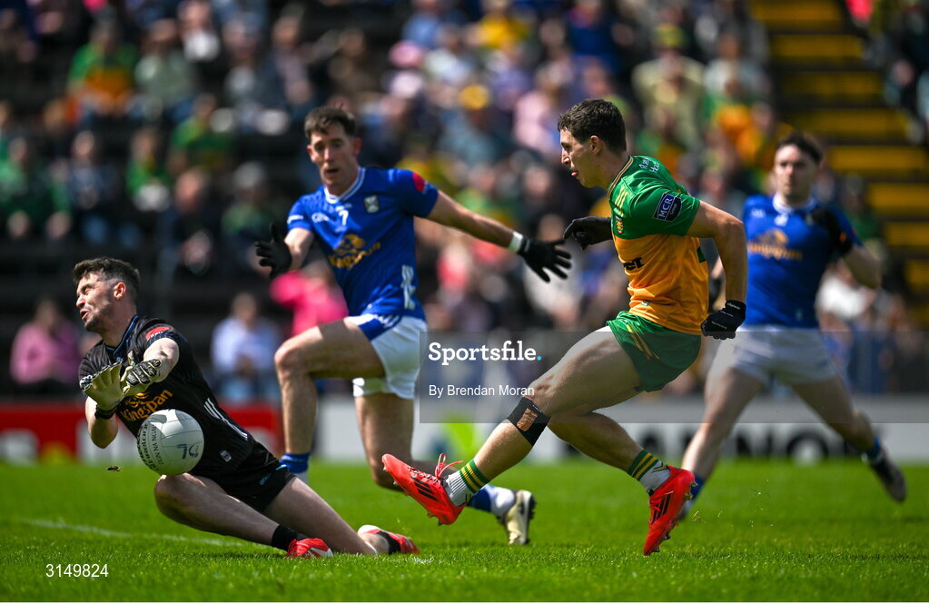 1 June 2025; Finnbarr Roarty of Donegal has a goalbound shot saved by Cavan goalkeeper Liam Brady during the GAA Football All-Ireland Senior Championship Round 2 match between Cavan and Donegal at Kingspan Breffni in Cavan. Photo by Brendan Moran/Sportsfile