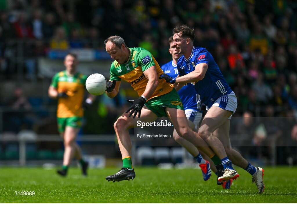 1 June 2025; Michael Murphy of Donegal in action against Dara McVeety of Cavan during the GAA Football All-Ireland Senior Championship Round 2 match between Cavan and Donegal at Kingspan Breffni in Cavan. Photo by Brendan Moran/Sportsfile