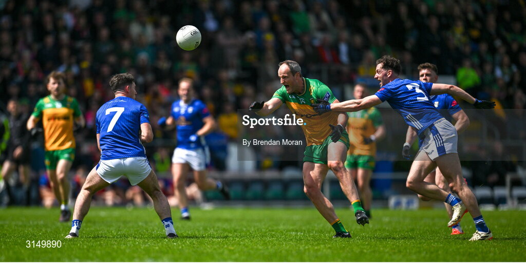 1 June 2025; Michael Murphy of Donegal in action against Brian O'Connell and Killian Brady of Cavan during the GAA Football All-Ireland Senior Championship Round 2 match between Cavan and Donegal at Kingspan Breffni in Cavan. Photo by Brendan Moran/Sportsfile
