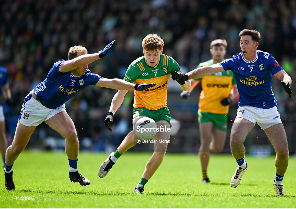 1 June 2025; Ciarán Moore of Donegal in action against Padraig Faulkner, left, and Killian Brady of Cavan during the GAA Football All-Ireland Senior Championship Round 2 match between Cavan and Donegal at Kingspan Breffni in Cavan. Photo by Brendan Moran/Sportsfile