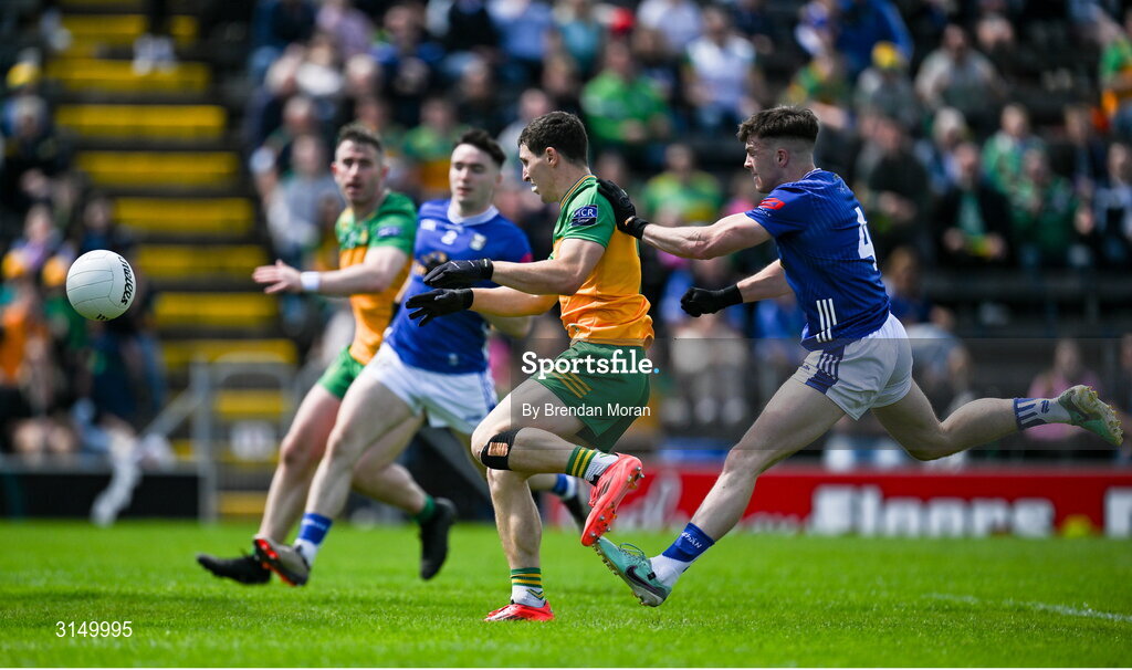 1 June 2025; Finnbarr Roarty of Donegal scores his side's first goal despite the efforts of Cian Reilly of Cavan during the GAA Football All-Ireland Senior Championship Round 2 match between Cavan and Donegal at Kingspan Breffni in Cavan. Photo by Brendan Moran/Sportsfile