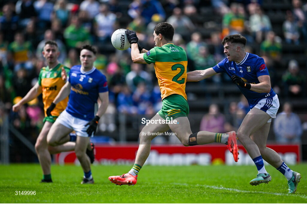 1 June 2025; Finnbarr Roarty of Donegal scores his side's first goal despite the efforts of Cian Reilly of Cavan during the GAA Football All-Ireland Senior Championship Round 2 match between Cavan and Donegal at Kingspan Breffni in Cavan. Photo by Brendan Moran/Sportsfile
