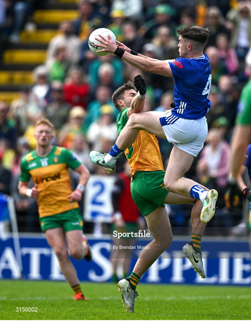 1 June 2025; Cian Reilly of Cavan in action against Conor O'Donnell of Donegal during the GAA Football All-Ireland Senior Championship Round 2 match between Cavan and Donegal at Kingspan Breffni in Cavan. Photo by Brendan Moran/Sportsfile