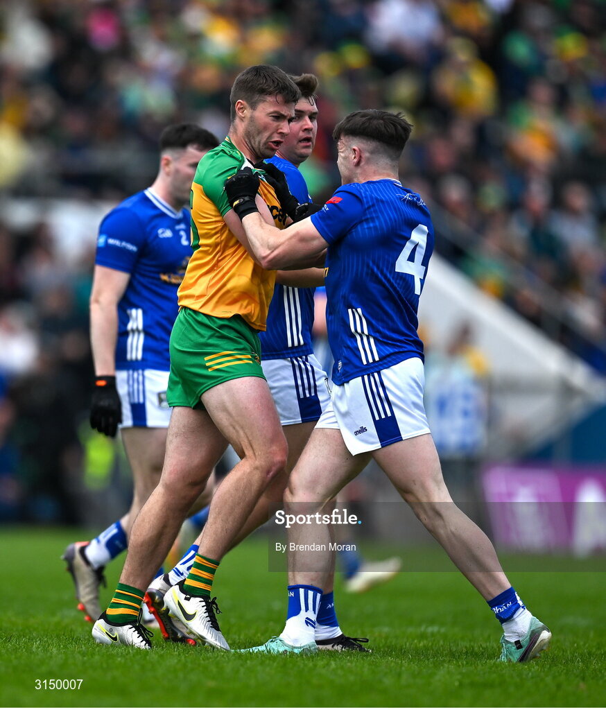 1 June 2025; Conor O'Donnell of Donegal, left, and Cian Reilly of Cavan during the GAA Football All-Ireland Senior Championship Round 2 match between Cavan and Donegal at Kingspan Breffni in Cavan. Photo by Brendan Moran/Sportsfile