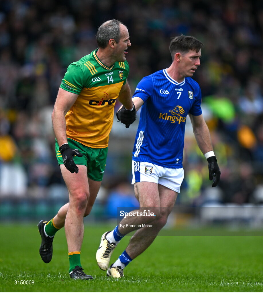 1 June 2025; Michael Murphy of Donegal has his hand held by Killian Brady of Cavan during the GAA Football All-Ireland Senior Championship Round 2 match between Cavan and Donegal at Kingspan Breffni in Cavan. Photo by Brendan Moran/Sportsfile