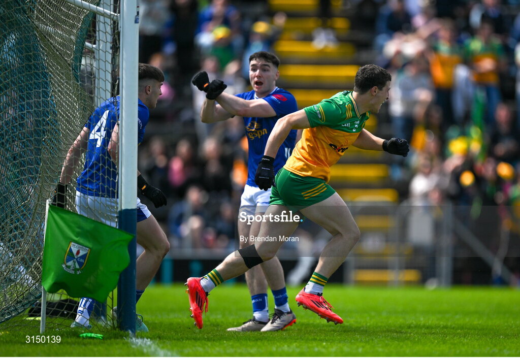 1 June 2025; Finnbarr Roarty of Donegal reacts after scoring his side's first goal during the GAA Football All-Ireland Senior Championship Round 2 match between Cavan and Donegal at Kingspan Breffni in Cavan. Photo by Brendan Moran/Sportsfile