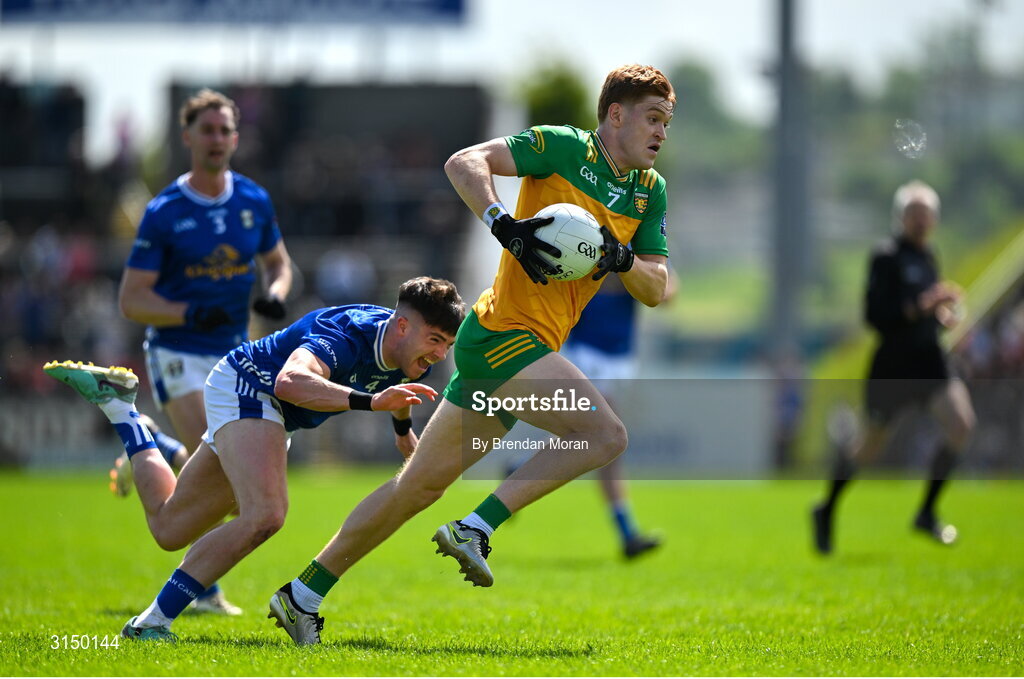 1 June 2025; Ciarán Moore of Donegal races clear of Cian Reilly of Cavan during the GAA Football All-Ireland Senior Championship Round 2 match between Cavan and Donegal at Kingspan Breffni in Cavan. Photo by Brendan Moran/Sportsfile