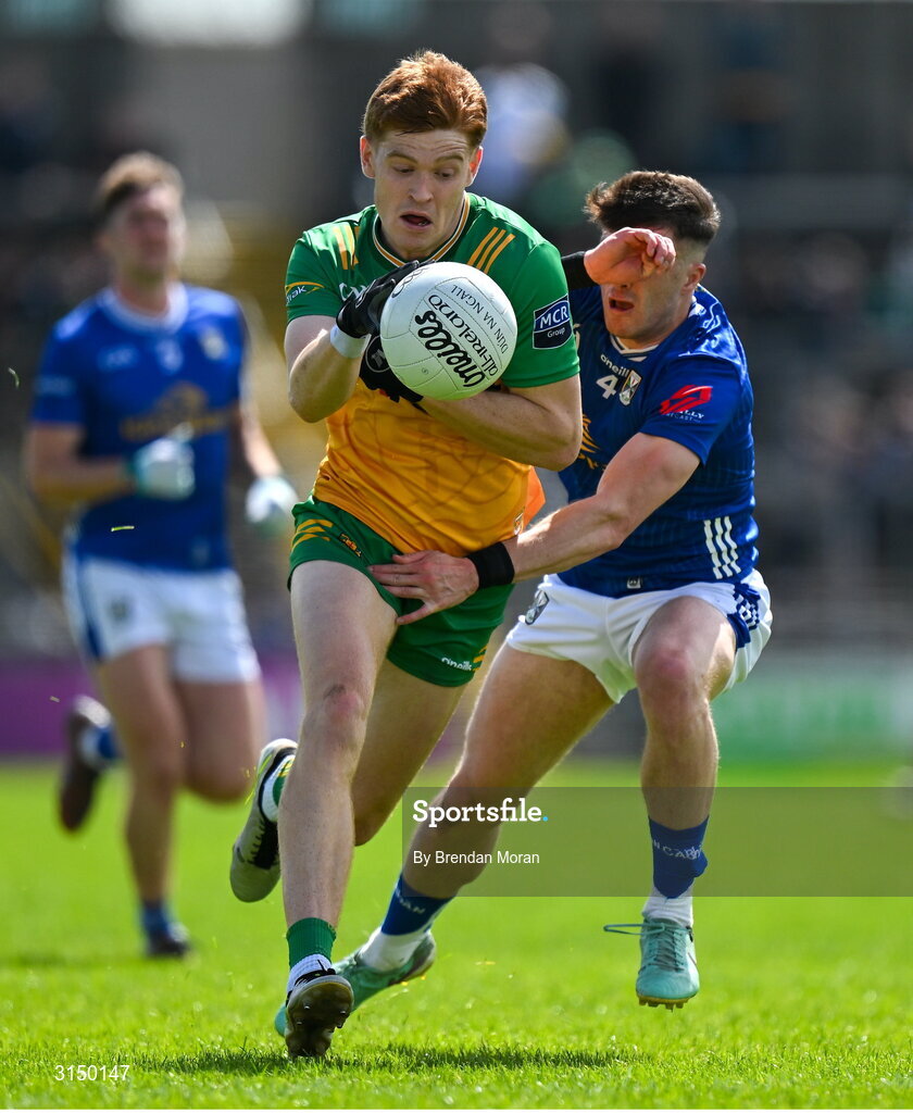 1 June 2025; Ciarán Moore of Donegal in action against Cian Reilly of Cavan during the GAA Football All-Ireland Senior Championship Round 2 match between Cavan and Donegal at Kingspan Breffni in Cavan. Photo by Brendan Moran/Sportsfile