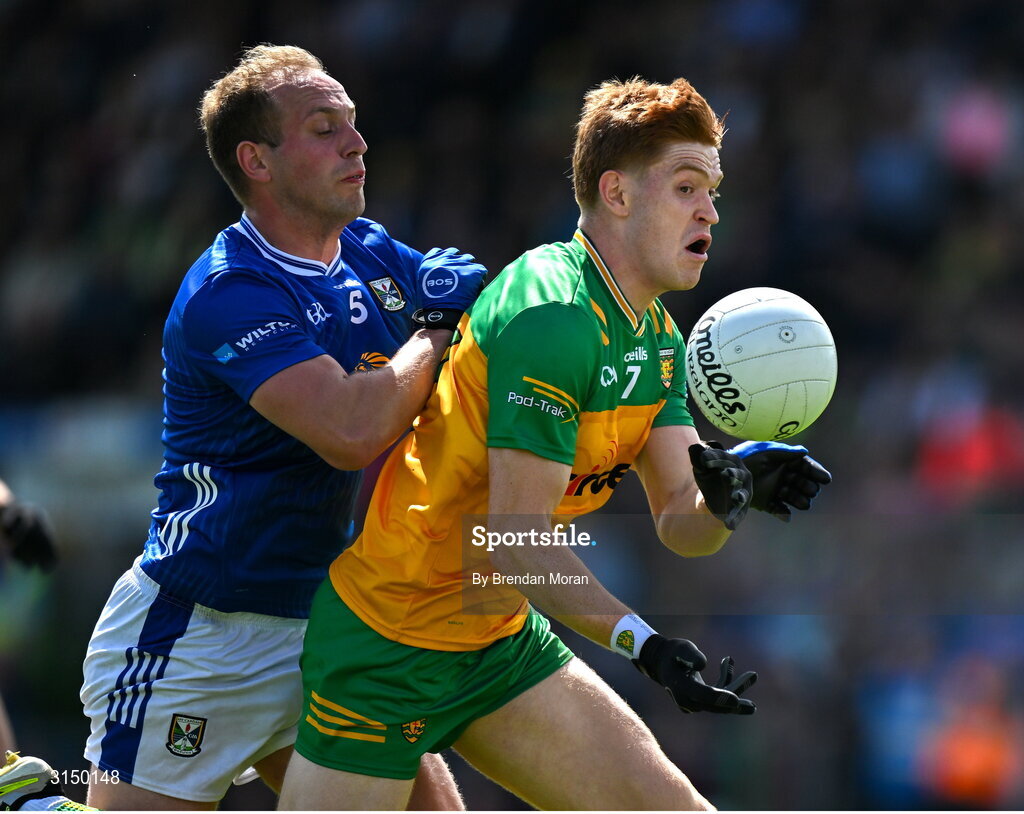 1 June 2025; Ciarán Moore of Donegal is tackled by Padraig Faulkner of Cavan during the GAA Football All-Ireland Senior Championship Round 2 match between Cavan and Donegal at Kingspan Breffni in Cavan. Photo by Brendan Moran/Sportsfile