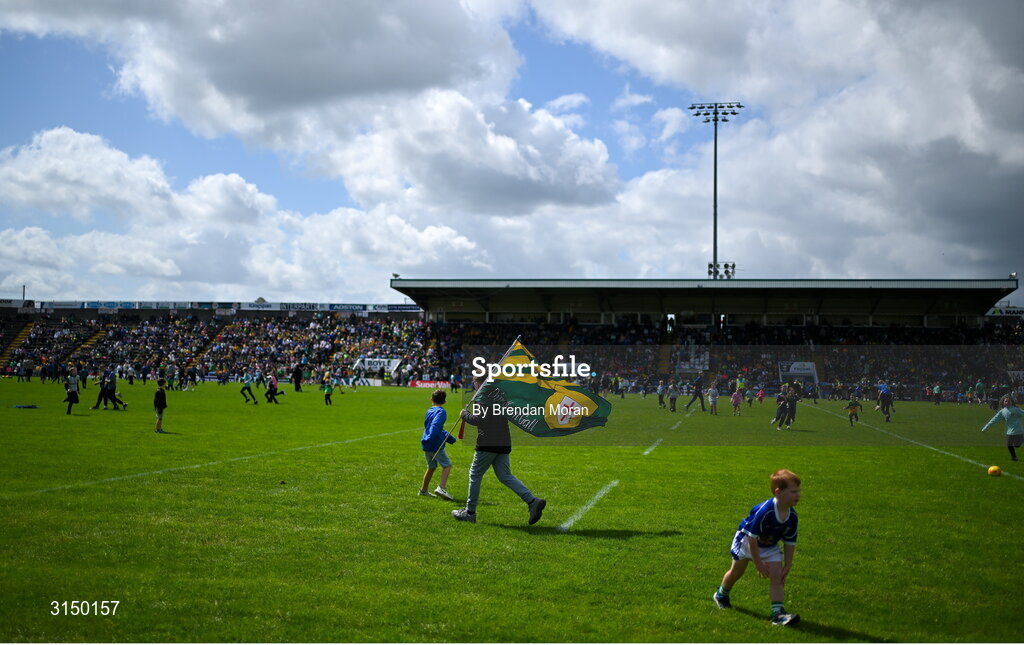 1 June 2025; Young supporters play on the pitch during the half-time break in the GAA Football All-Ireland Senior Championship Round 2 match between Cavan and Donegal at Kingspan Breffni in Cavan. Photo by Brendan Moran/Sportsfile
