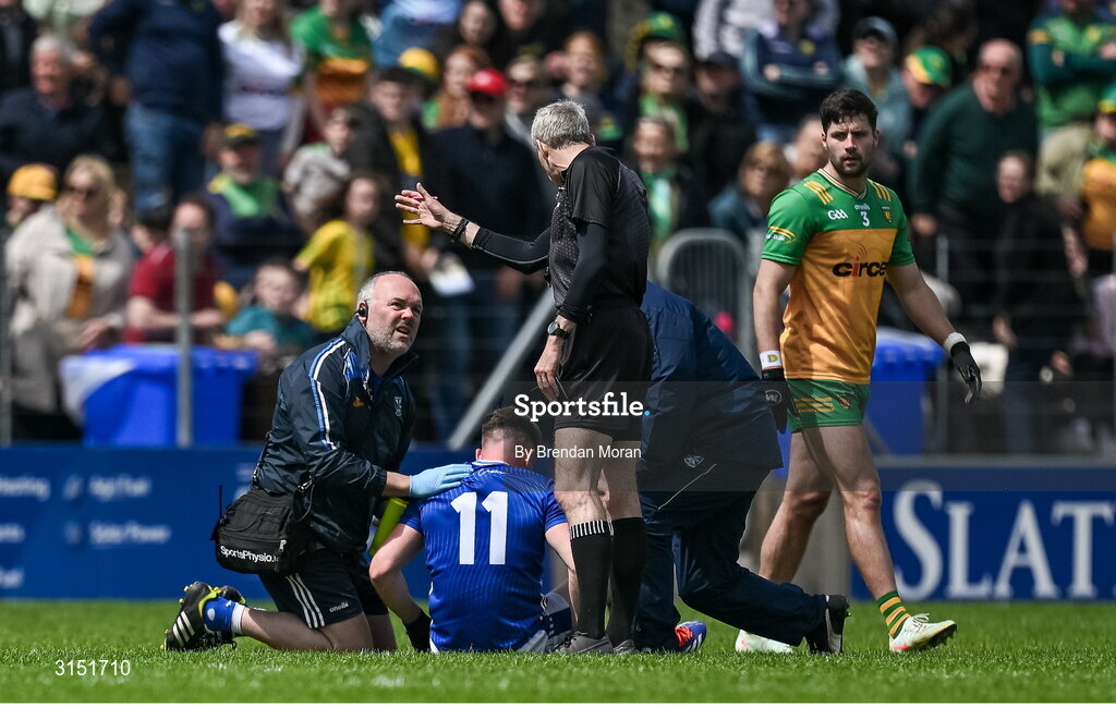 1 June 2025; Referee Fergal Kelly looks on as Dara McVeety of Cavan receives medical treatment during the GAA Football All-Ireland Senior Championship Round 2 match between Cavan and Donegal at Kingspan Breffni in Cavan. Photo by Brendan Moran/Sportsfile