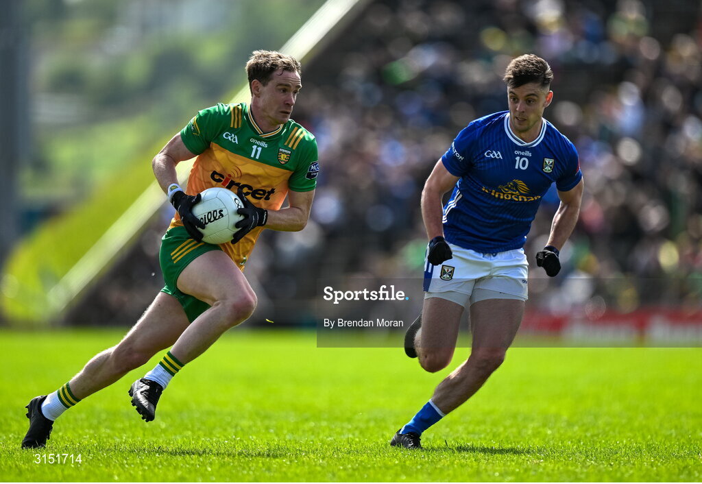 1 June 2025; Ciarán Thompson of Donegal in action against Gerard Smith of Cavan during the GAA Football All-Ireland Senior Championship Round 2 match between Cavan and Donegal at Kingspan Breffni in Cavan. Photo by Brendan Moran/Sportsfile