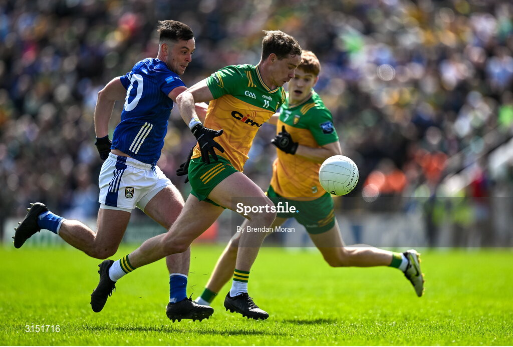 1 June 2025; Ciarán Thompson of Donegal in action against Gerard Smith of Cavan during the GAA Football All-Ireland Senior Championship Round 2 match between Cavan and Donegal at Kingspan Breffni in Cavan. Photo by Brendan Moran/Sportsfile