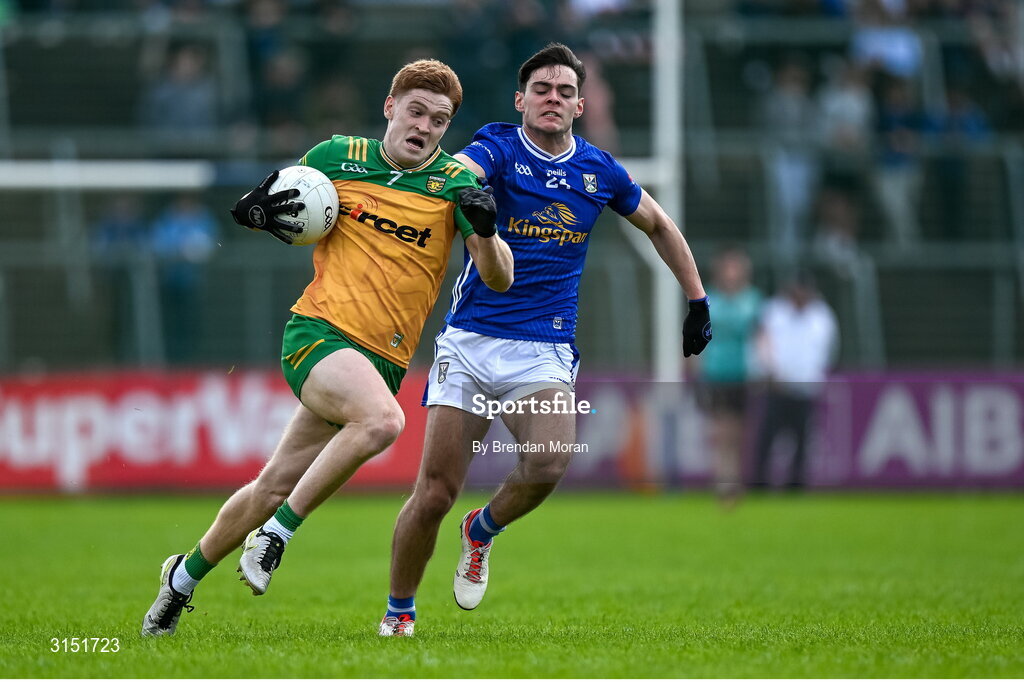 1 June 2025; Ciarán Moore of Donegal in action against Oisin Brady of Cavan during the GAA Football All-Ireland Senior Championship Round 2 match between Cavan and Donegal at Kingspan Breffni in Cavan. Photo by Brendan Moran/Sportsfile