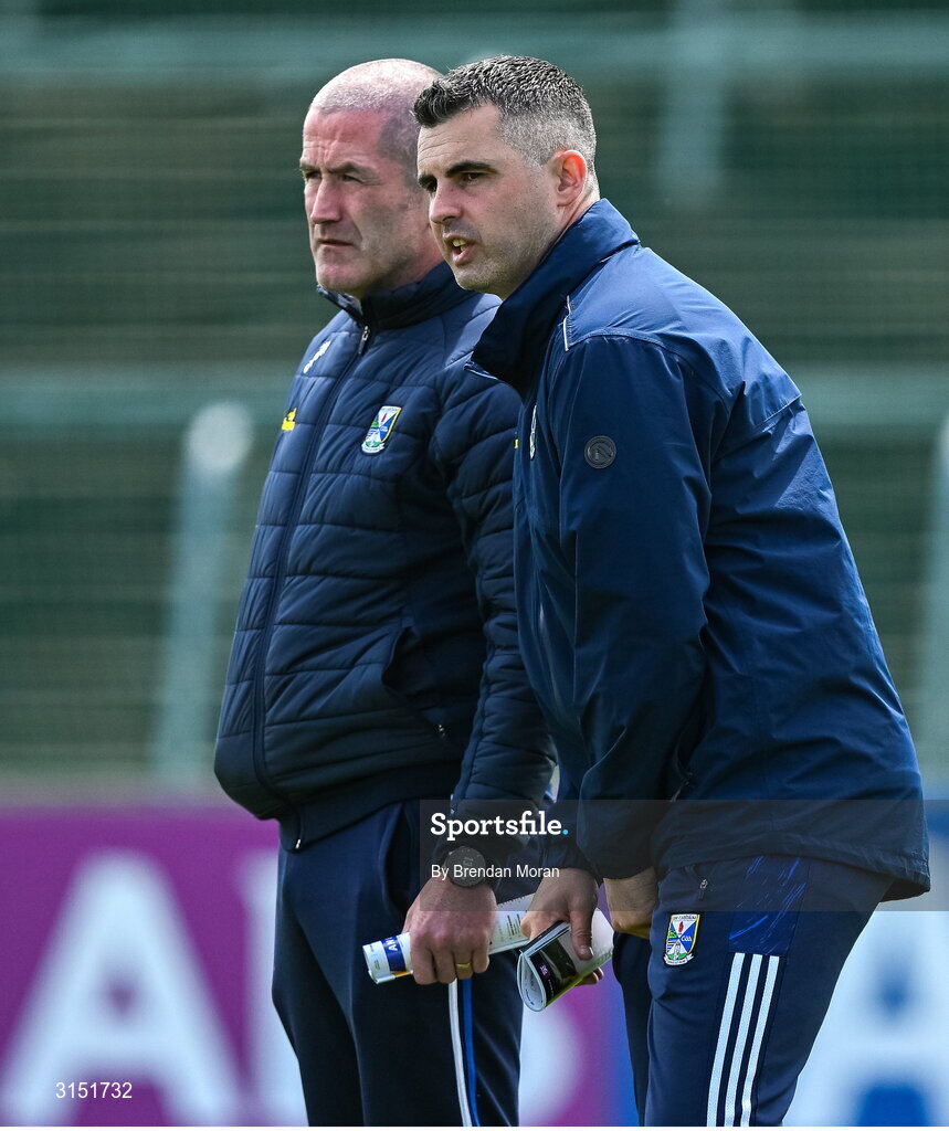 1 June 2025; Cavan manager Raymond Galligan, right, and forwards coach Stephen O'Neill before the GAA Football All-Ireland Senior Championship Round 2 match between Cavan and Donegal at Kingspan Breffni in Cavan. Photo by Brendan Moran/Sportsfile