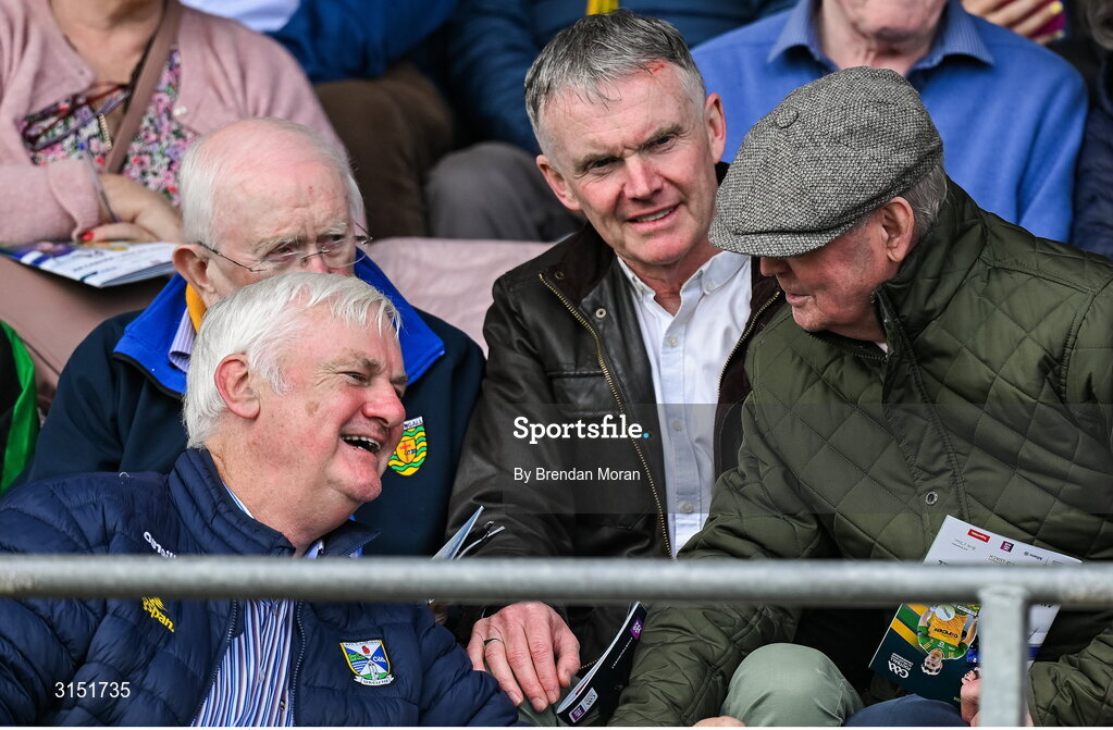 1 June 2025; Iar-Uachtarán Chumann Lúthchleas Gael Aogán Ó Fearghail, left, in converation with former Donegal manager Brian McEniff before the GAA Football All-Ireland Senior Championship Round 2 match between Cavan and Donegal at Kingspan Breffni in Cavan. Photo by Brendan Moran/Sportsfile