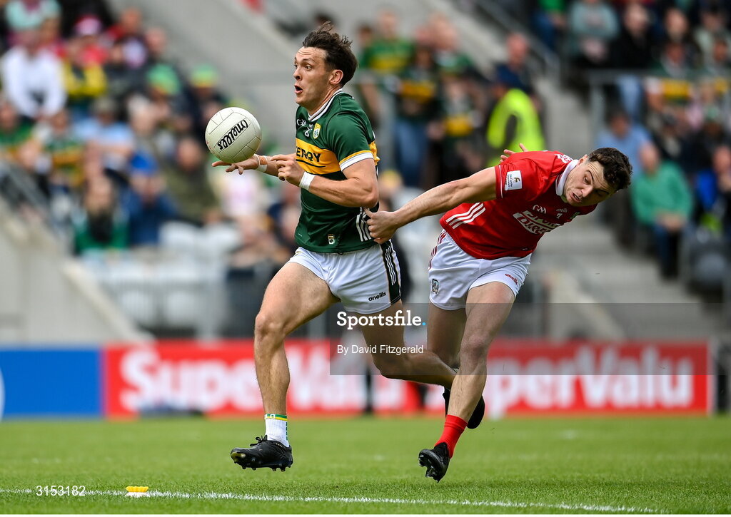 31 May 2025; David Clifford of Kerry in action against Daniel O' Mahony of Cork during the GAA Football All-Ireland Senior Championship Round 2 match between Cork and Kerry at SuperValu Páirc Uí Chaoimh in Cork. Photo by David Fitzgerald/Sportsfile