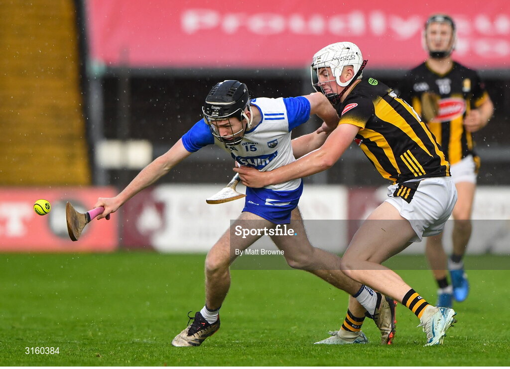 14 June 2025; Jamie Shanahan of Waterford in action against PJ Mackey of Kilkenny during the Electric Ireland GAA All-Ireland Minor Championship semi-final match between Kilkenny and Waterford Chadwicks Wexford Park in Wexford. Photo by Matt Browne/Sportsfile