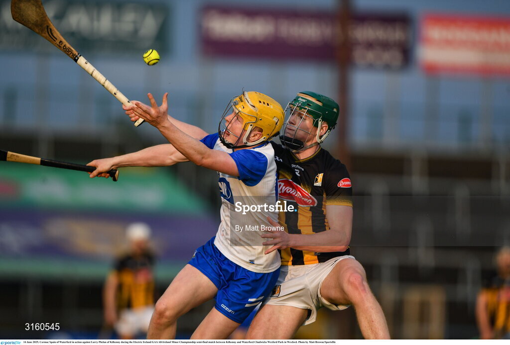 14 June 2025; Cormac Spain of Waterford in action against Larry Phelan of Kilkenny during the Electric Ireland GAA All-Ireland Minor Championship semi-final match between Kilkenny and Waterford Chadwicks Wexford Park in Wexford. Photo by Matt Browne/Sportsfile