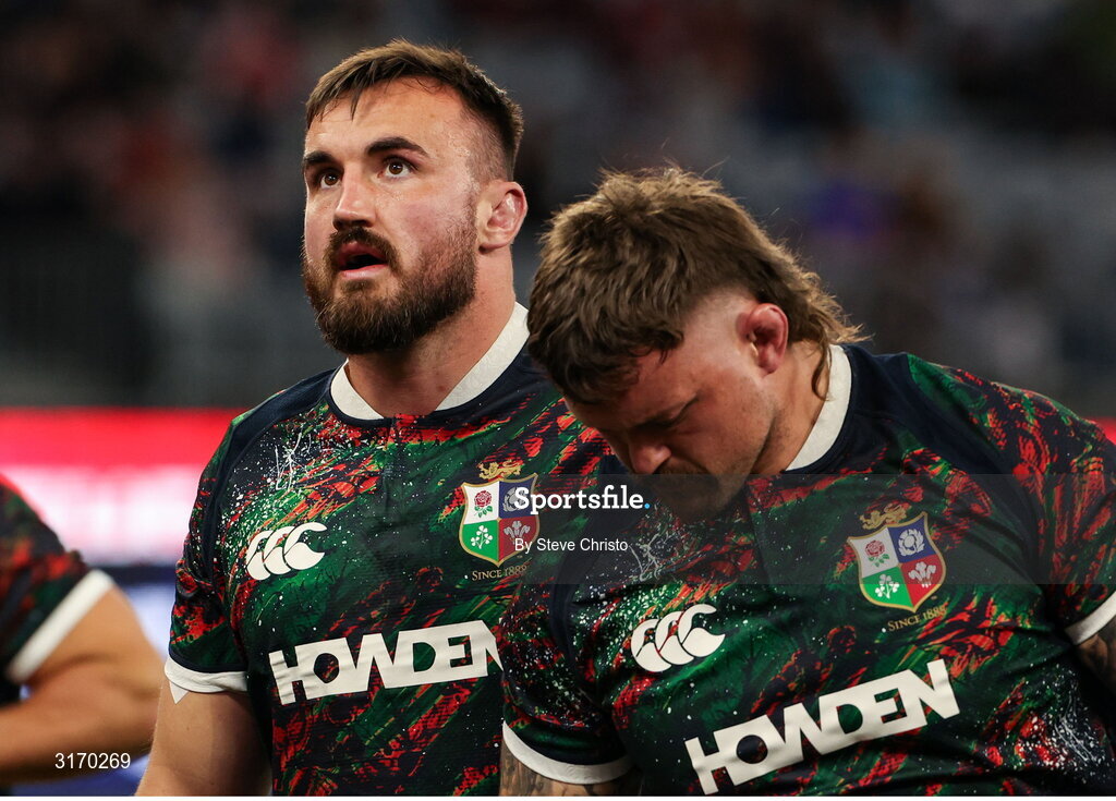 28 June 2025; Rónan Kelleher, left, and Andrew Porter of British & Irish Lions before the tour match between Western Force and the British & Irish Lions at Optus Stadium in Perth, Australia. Photo by Steve Christo/Sportsfile