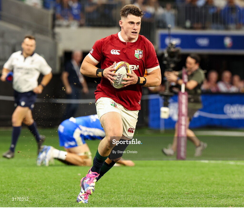 28 June 2025; Dan Sheehan of British & Irish Lions runs through to score his side's first try during the tour match between Western Force and the British & Irish Lions at Optus Stadium in Perth, Australia. Photo by Steve Christo/Sportsfile