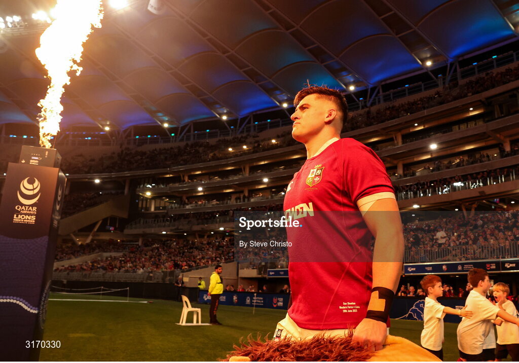 28 June 2025; British & Irish Lions captain Dan Sheehan leads his side onto the pitch before the tour match between Western Force and the British & Irish Lions at Optus Stadium in Perth, Australia. Photo by Steve Christo/Sportsfile