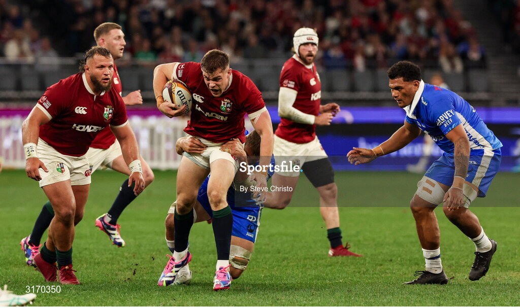 28 June 2025; Garry Ringrose of British & Irish Lions is tackled during the tour match between Western Force and the British & Irish Lions at Optus Stadium in Perth, Australia. Photo by Steve Christo/Sportsfile