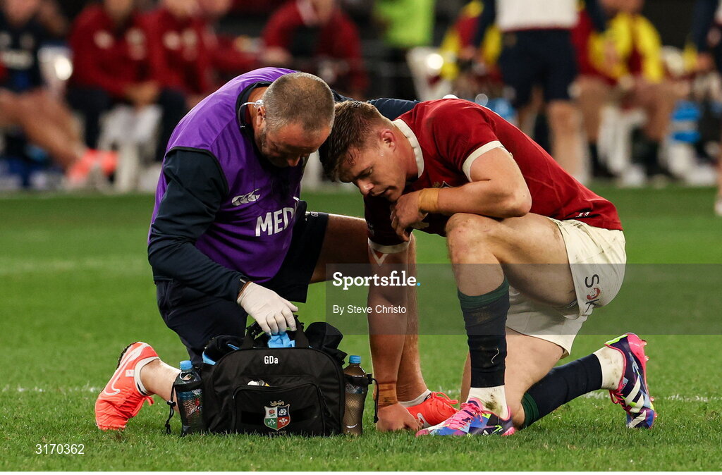 28 June 2025; Garry Ringrose of British & Irish Lions receives medical attention from team doctor Geoff Davies during the tour match between Western Force and the British & Irish Lions at Optus Stadium in Perth, Australia. Photo by Steve Christo/Sportsfile