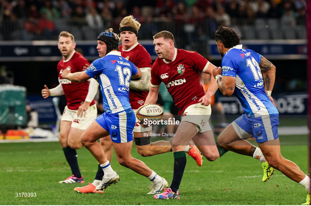 28 June 2025; Finn Russell of British & Irish Lions makes a break in the lead up to his side's third try, scored by Elliot Daly, left, during the tour match between Western Force and the British & Irish Lions at Optus Stadium in Perth, Australia. Photo by Steve Christo/Sportsfile