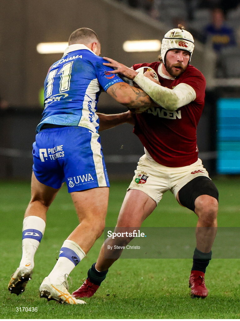 28 June 2025; Mack Hansen of British & Irish Lions is tackled by Dylan Pietsch of Western Force during the tour match between Western Force and the British & Irish Lions at Optus Stadium in Perth, Australia. Photo by Steve Christo/Sportsfile
