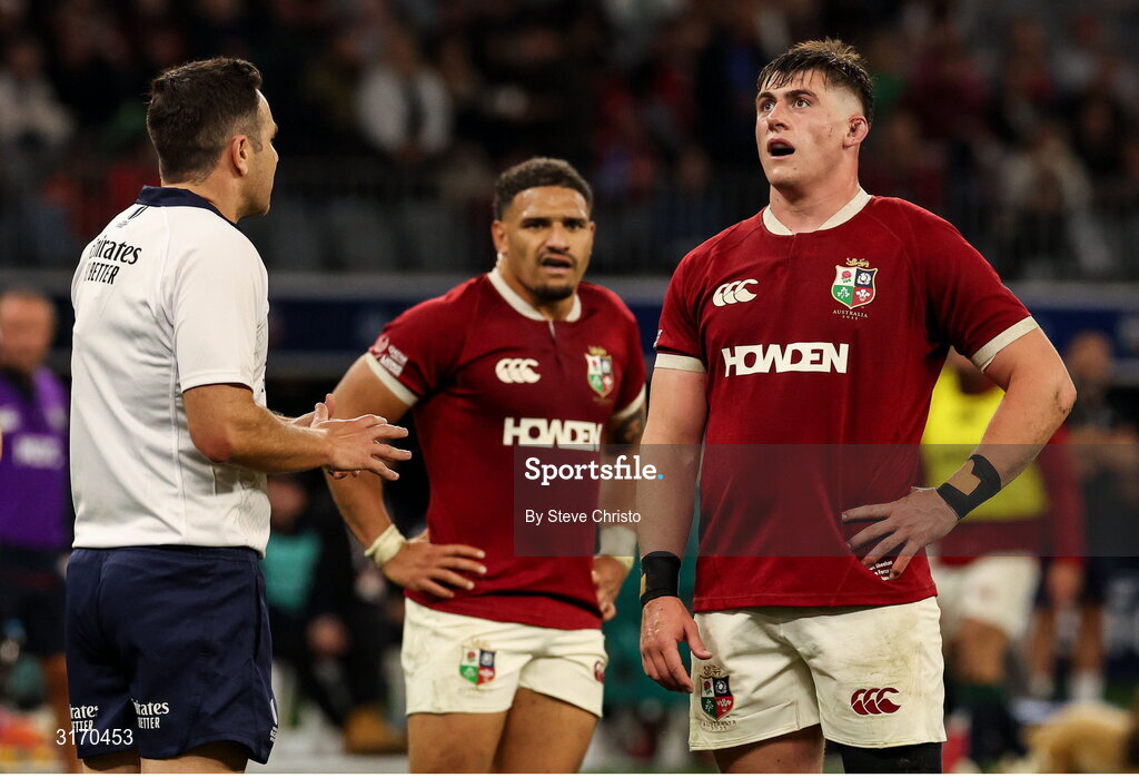 28 June 2025; Referee Ben O'Keeffe speaks to British & Irish Lions captain Dan Sheehan during the tour match between Western Force and the British & Irish Lions at Optus Stadium in Perth, Australia. Photo by Steve Christo/Sportsfile