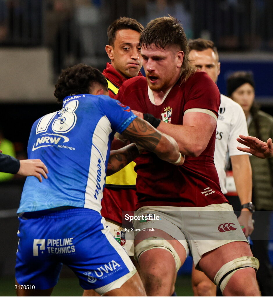 28 June 2025; Joe McCarthy of British & Irish Lions tussles with Matt Proctor of Western Force during the tour match between Western Force and the British & Irish Lions at Optus Stadium in Perth, Australia. Photo by Steve Christo/Sportsfile