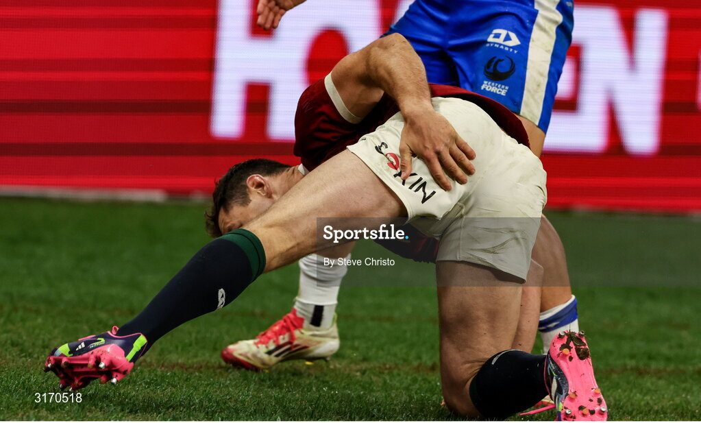 28 June 2025; Tomos Williams of British & Irish Lions holds his leg after scoring his second and his side's fourth try during the tour match between Western Force and the British & Irish Lions at Optus Stadium in Perth, Australia. Photo by Steve Christo/Sportsfile