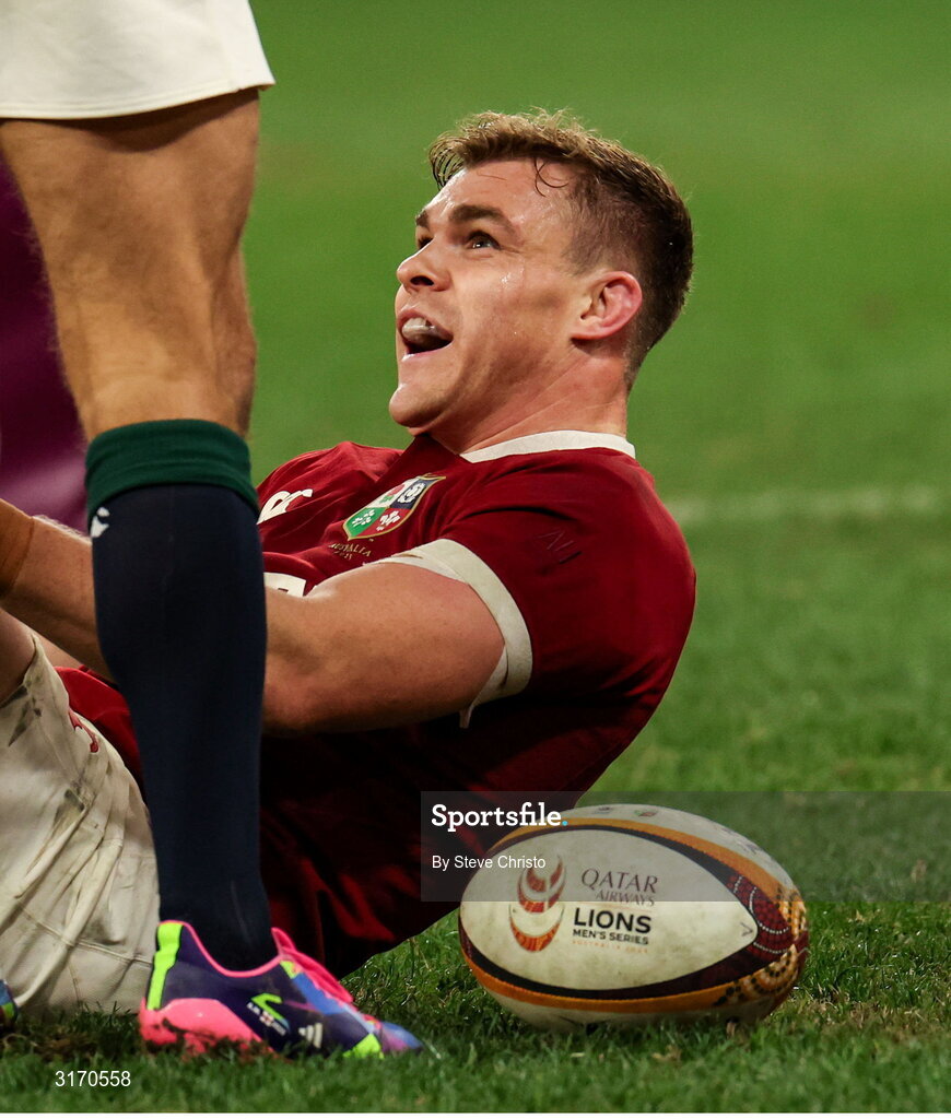 28 June 2025; Garry Ringrose of British & Irish Lions after scoring his side's fifth try during the tour match between Western Force and the British & Irish Lions at Optus Stadium in Perth, Australia. Photo by Steve Christo/Sportsfile