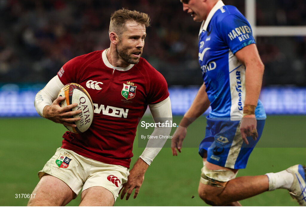 28 June 2025; Elliot Daly of British & Irish Lions runs in his second and his side's seventh try during the tour match between Western Force and the British & Irish Lions at Optus Stadium in Perth, Australia. Photo by Steve Christo/Sportsfile