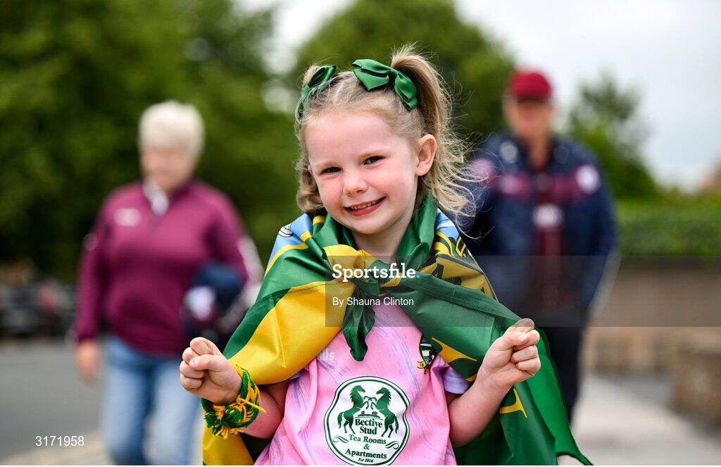 29 June 2025; Meath supporter Holly Flaherty, aged six, from Ballivor in Meath, as two Galway supporters walk by before the GAA Football All-Ireland Senior Championship quarter-final match between Meath and Galway at Croke Park in Dublin. Photo by Shauna Clinton/Sportsfile