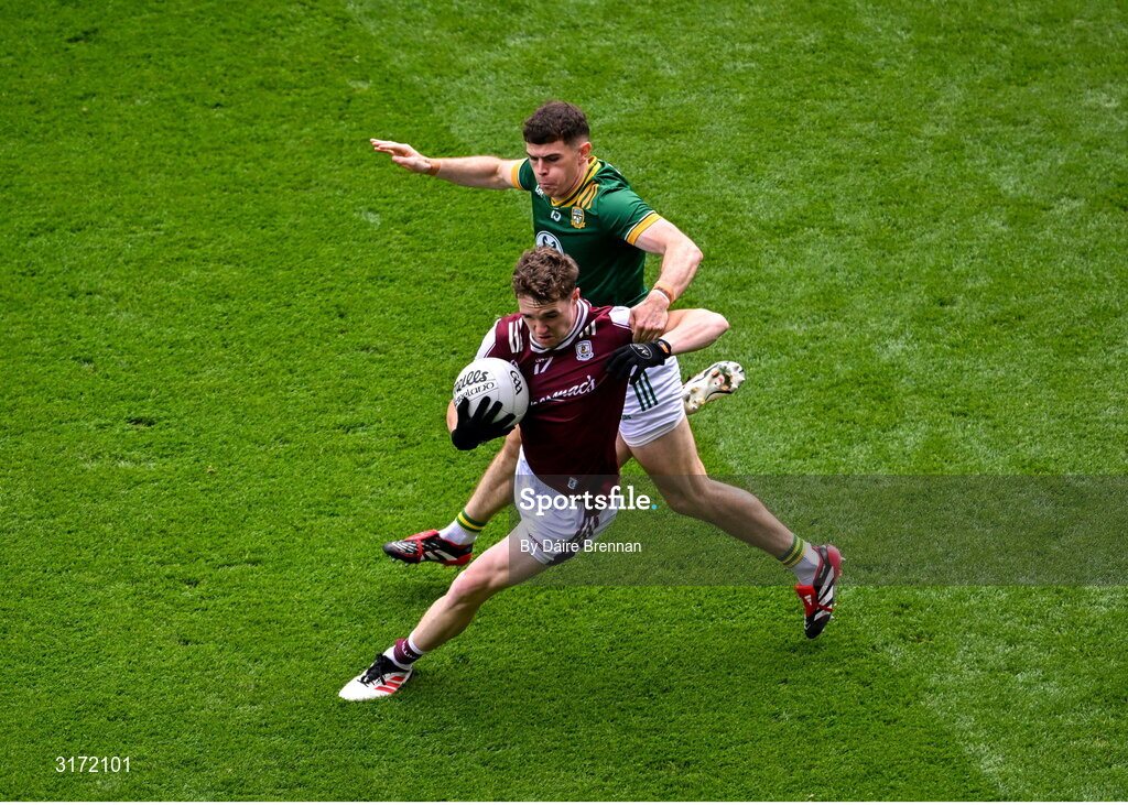 29 June 2025; Jack Glynn of Galway in action against Eoghan Frayne of Meath during the GAA Football All-Ireland Senior Championship quarter-final match between Meath and Galway at Croke Park in Dublin. Photo by Daire Brennan/Sportsfile
