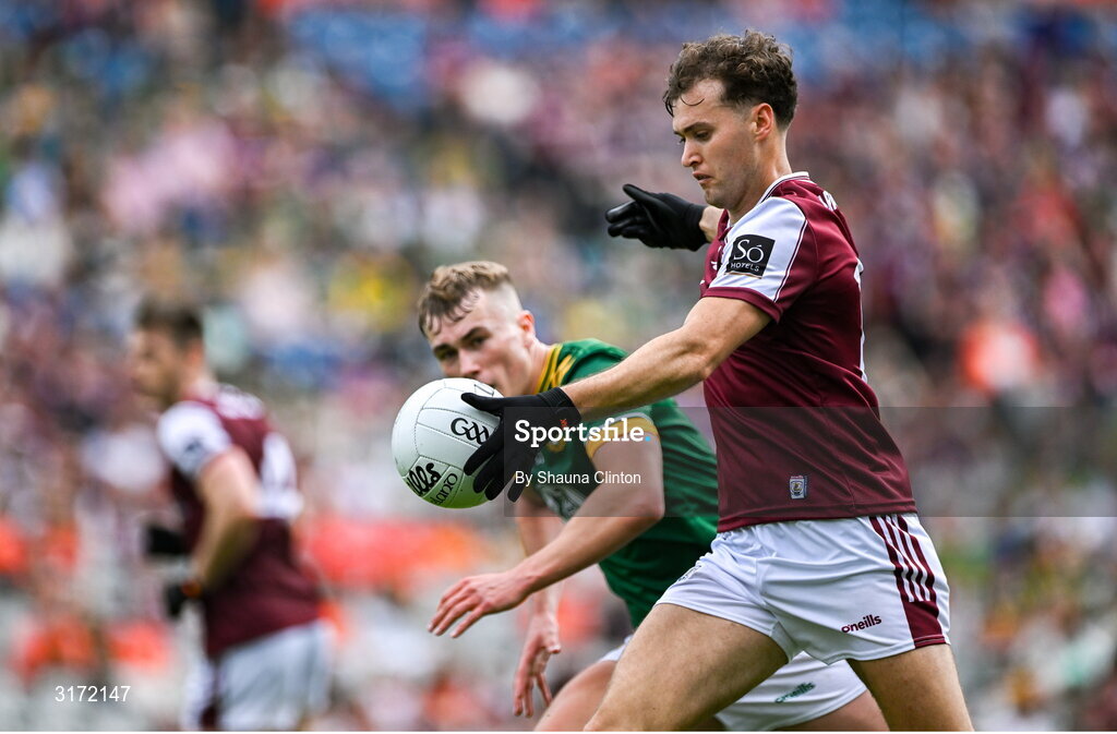29 June 2025; Robert Finnerty of Galway in action against Ruairí Kinsella of Meath during the GAA Football All-Ireland Senior Championship quarter-final match between Meath and Galway at Croke Park in Dublin. Photo by Shauna Clinton/Sportsfile