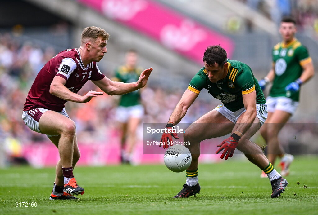 29 June 2025; Donal Keogan of Meath in action against Dylan McHugh of Galway during the GAA Football All-Ireland Senior Championship quarter-final match between Meath and Galway at Croke Park in Dublin. Photo by Piaras Ó Mídheach/Sportsfile