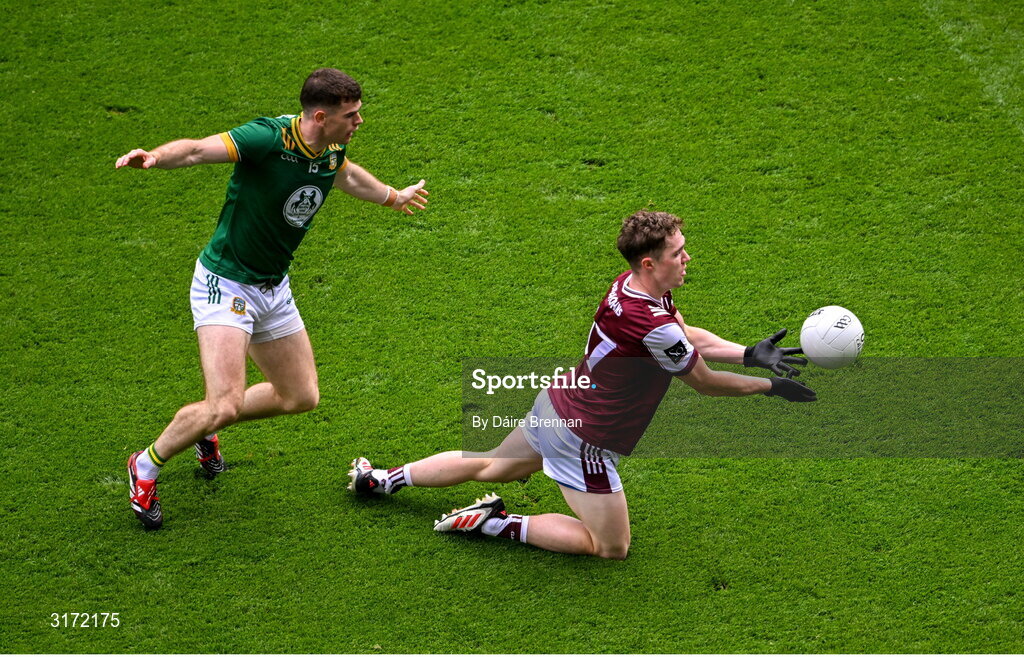 29 June 2025; Jack Glynn of Galway in action against Eoghan Frayne of Meath during the GAA Football All-Ireland Senior Championship quarter-final match between Meath and Galway at Croke Park in Dublin. Photo by Daire Brennan/Sportsfile