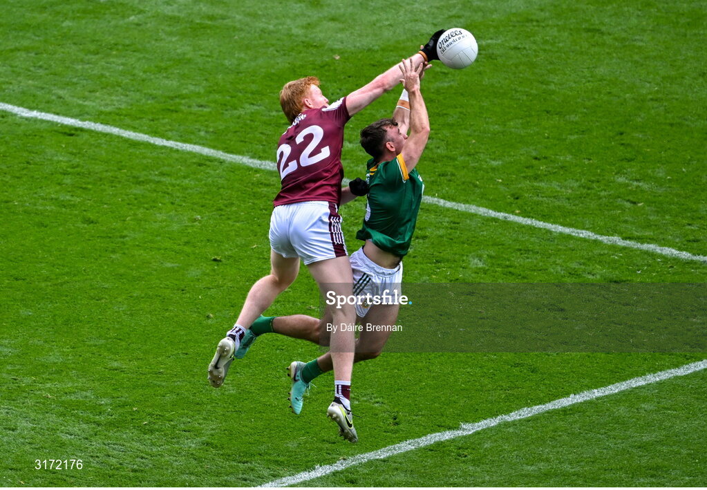 29 June 2025; Seán Coffey of Meath in action against Peter Cooke of Galway during the GAA Football All-Ireland Senior Championship quarter-final match between Meath and Galway at Croke Park in Dublin. Photo by Daire Brennan/Sportsfile