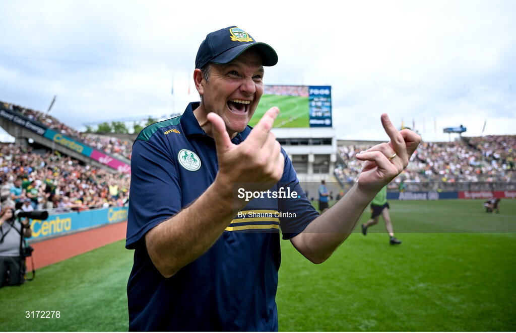 29 June 2025; Meath manager Robbie Brennan celebrates at the final whistle of the GAA Football All-Ireland Senior Championship quarter-final match between Meath and Galway at Croke Park in Dublin. Photo by Shauna Clinton/Sportsfile
