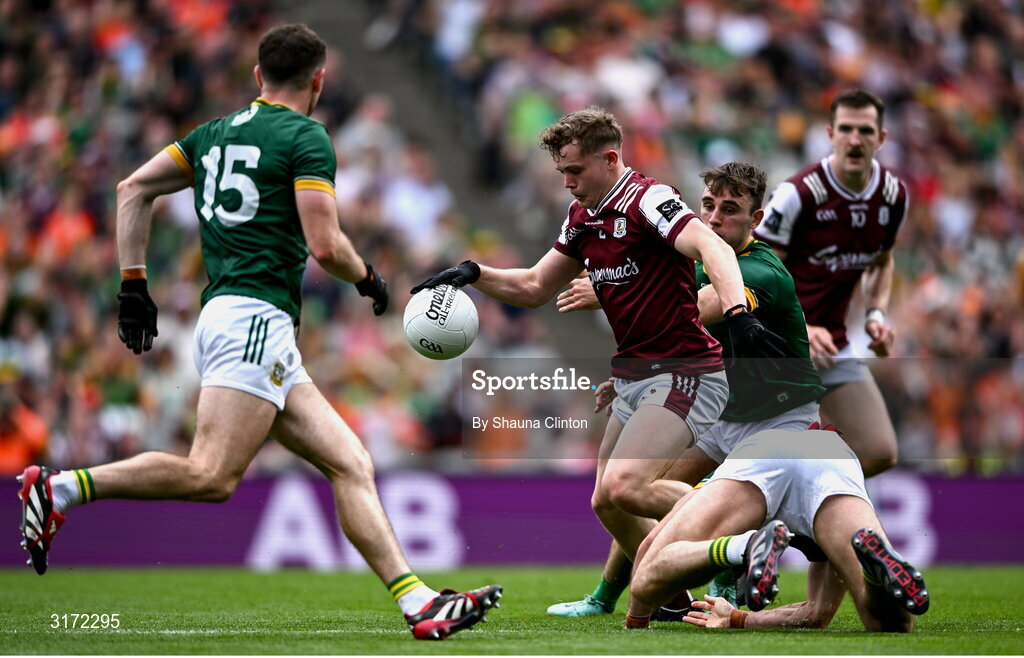 29 June 2025; Johnny McGrath of Galway is tackled by Donal Keogan of Meath during the GAA Football All-Ireland Senior Championship quarter-final match between Meath and Galway at Croke Park in Dublin. Photo by Shauna Clinton/Sportsfile