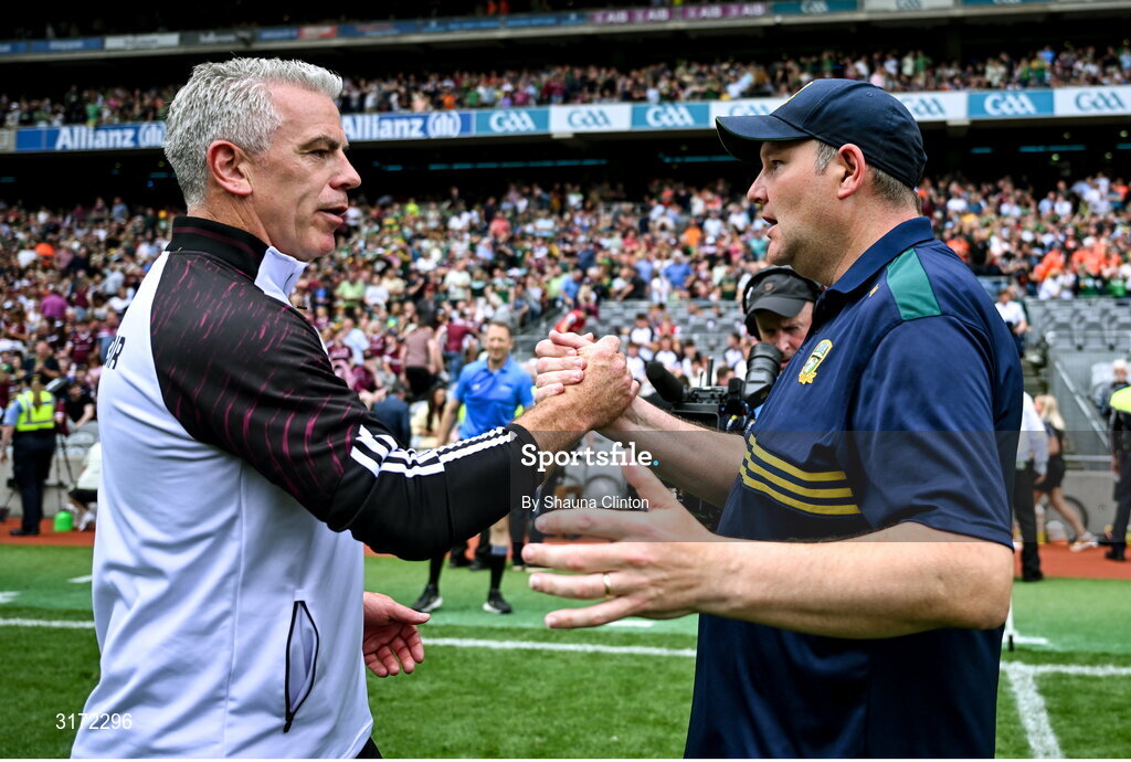29 June 2025; Galway manager Padraic Joyce, left, and Meath manager Robbie Brennan after the GAA Football All-Ireland Senior Championship quarter-final match between Meath and Galway at Croke Park in Dublin. Photo by Shauna Clinton/Sportsfile