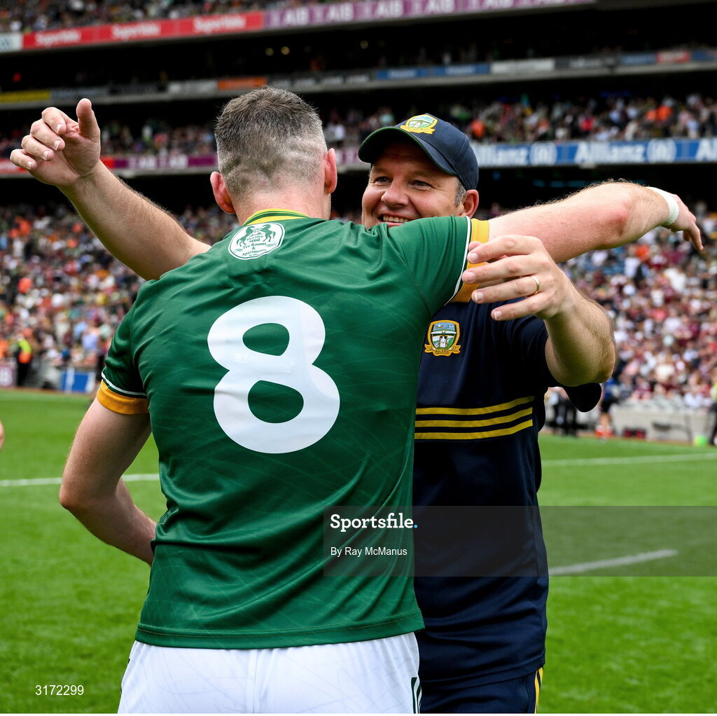 29 June 2025; Meath manager Robbie Brennan and Bryan Menton of Meath after the GAA Football All-Ireland Senior Championship quarter-final match between Meath and Galway at Croke Park in Dublin. Photo by Ray McManus/Sportsfile