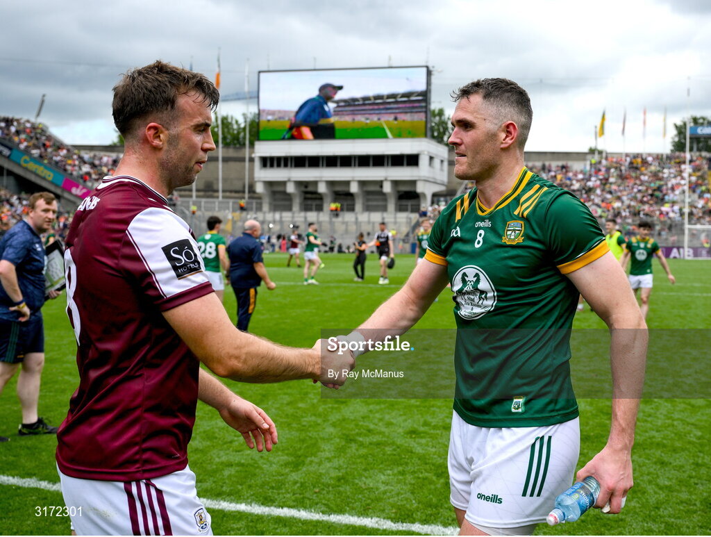 29 June 2025; Paul Conroy of Galway and Bryan Menton of Meath after the GAA Football All-Ireland Senior Championship quarter-final match between Meath and Galway at Croke Park in Dublin. Photo by Ray McManus/Sportsfile