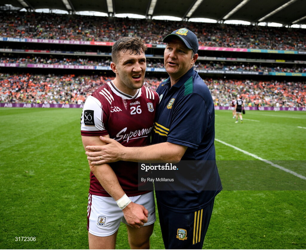 29 June 2025; Meath manager Robbie Brennan and Damien Comer of Galway after the GAA Football All-Ireland Senior Championship quarter-final match between Meath and Galway at Croke Park in Dublin. Photo by Ray McManus/Sportsfile